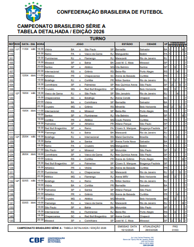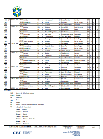 A CBF publicou na tarde deste domingo (29) a tabela detalhada das rodadas 11 a 17 do Brasileirão Betano 2026. O documento contém informações sobre datas, locais e horários das partidas, bem como em quais veículos e plataformas os jogos serão transmitidos.